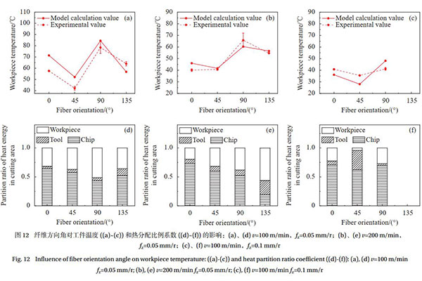 以T700碳纖維與聚醚醚酮(PEEK)復材制備而成的不同碳纖維角度板材的機加工數(shù)據(jù)為例,實驗結(jié)果顯示,在相同工藝條件下,纖維方向為90°和135°的板材傳入工件的熱分配比例系數(shù)和工件溫度明顯高于纖維方向為0°和45°的情況。另外,不論纖維方向如何變化,加工過程中傳入切屑和工件的熱分配比例始終大于傳入刀具的熱分配比例。切削速度和進給量對工件溫度有顯著影響,通常情況下,隨著切削速度的增加,工件溫度會先上升后下降,在切削速度約為v=100 m/min時達到峰值。