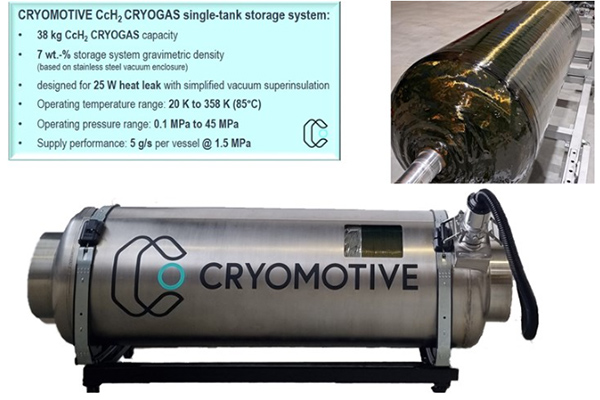 Cryogas 儲罐采用碳纖維/環氧樹脂預浸帶包裹的內容器,可高密度儲存低溫壓縮氫氣 (CcH2)。